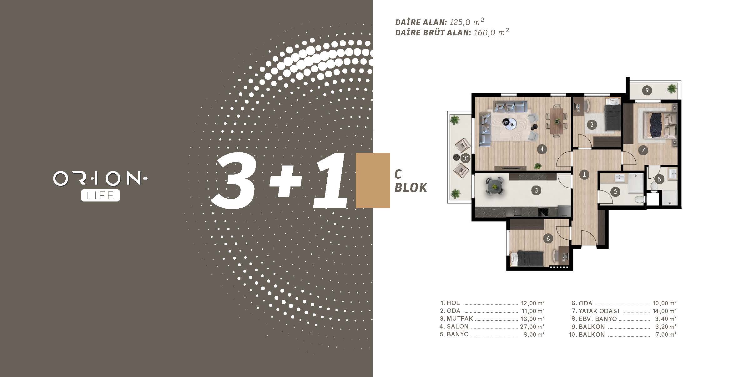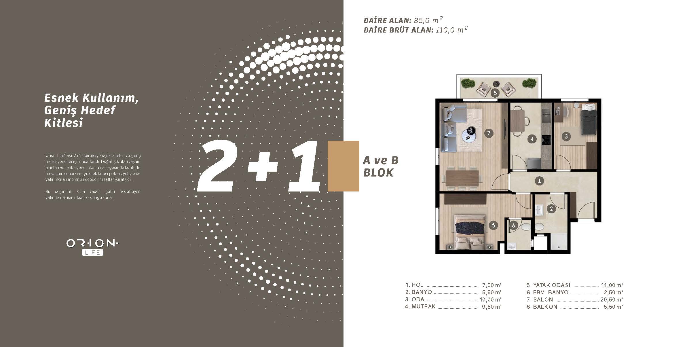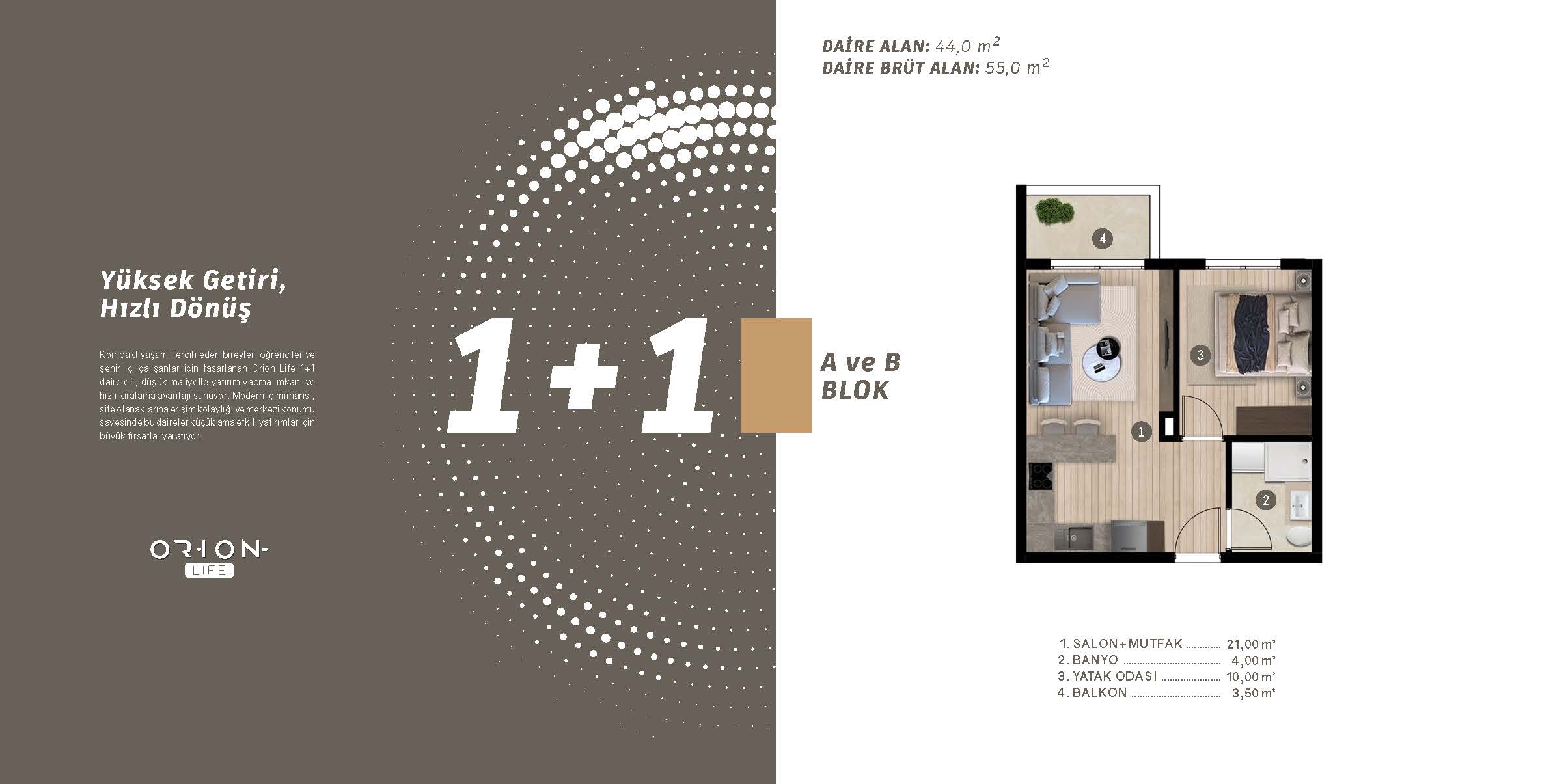 Orion Life, farklı yaşam ihtiyaçlarına özel olarak planlanmış 1+1, 2+1 ve 3+1 daire tipleriyle her zevke ve yaşam stiline hitap ediyor. Her daire, ferahlık, işlevsellik ve estetik arasında mükemmel bir denge kurar.